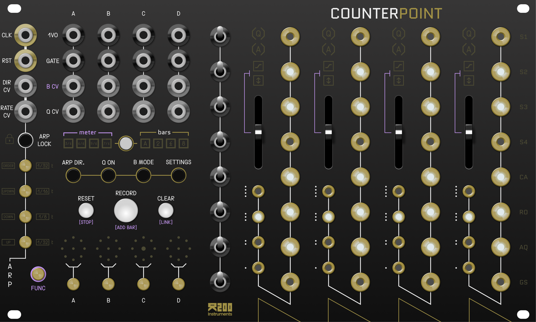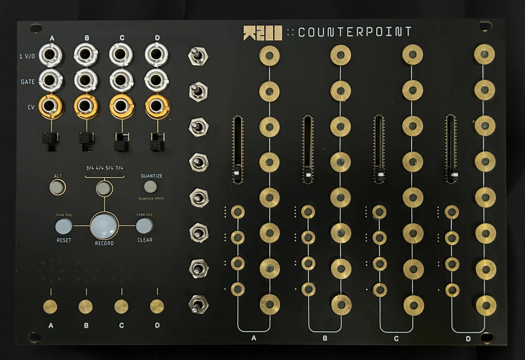Hands-on Eurorack sequencer which uses brass touch pads to independently control 4 oscillators, bring 4-note polyphony to your Eurorack system. It features live sequencing, performative arpeggiator, CV quantization, and per-channel pitch bend / portamento.